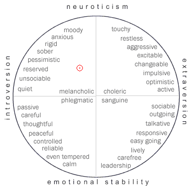 Prior to Eysenck's discovery of Psychoticism, he correlated his original two traits (introversion and neuroticism) with an ancient greek personality system known as the Galen types (Melancholic, Choleric, Sanguine, Phlegmatic). Below is a plotting of your introversion and extraversion scores on that map.